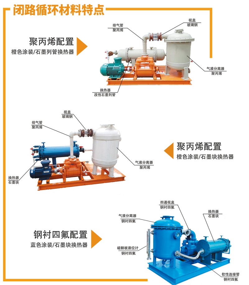耐腐蝕液環泵可以升級為閉路循環系統,它由FSK系列、F2SK系列、F2BV系列、F2BE系列和JZJFS羅茨泵系列,與真空換緩沖罐、汽液分離器、換熱器、連接管路等串聯組成。閉路循環與用戶DCS 連接可實現自動控制。