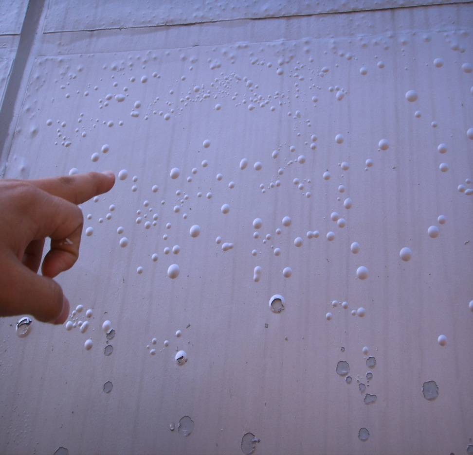 3、漆膜封閉性好,附近窗臺、雨盆板、樓面等 有水滲入墻體內(nèi),氣溫高時蒸發(fā)不出,聚集后頂起涂層;
